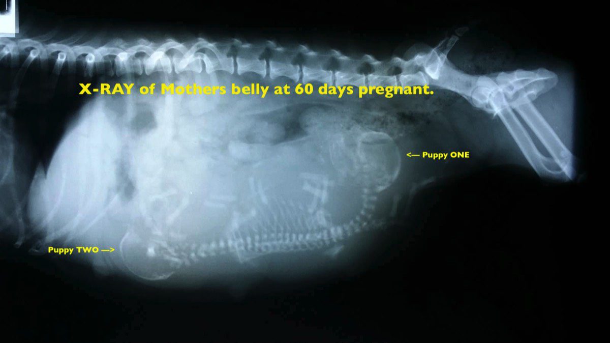 This is an X-ray of Goose's pups at about 50 days pregnant. You should be able to count 7 spines and 7 skulls.